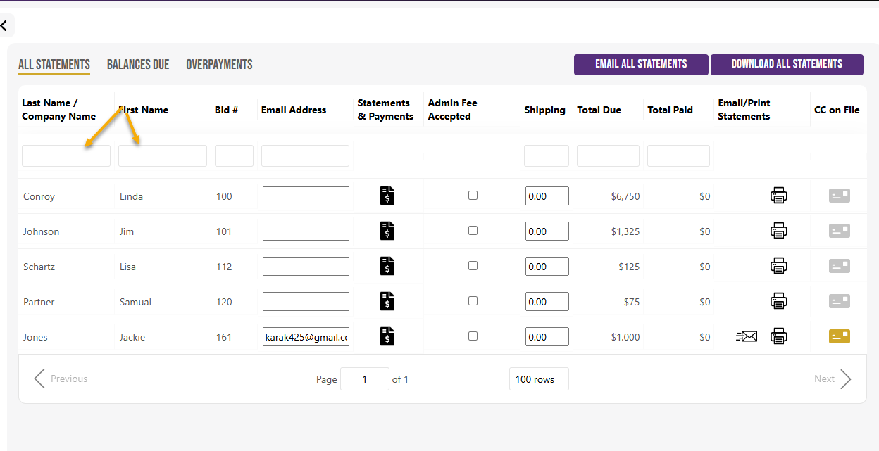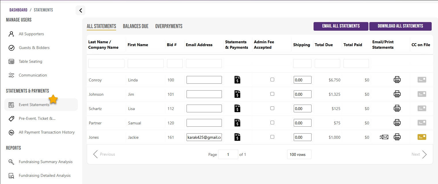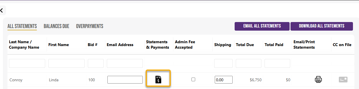 - Click the statement icon (paper with a dollar sign) next to the guest in the Statements & Payments column