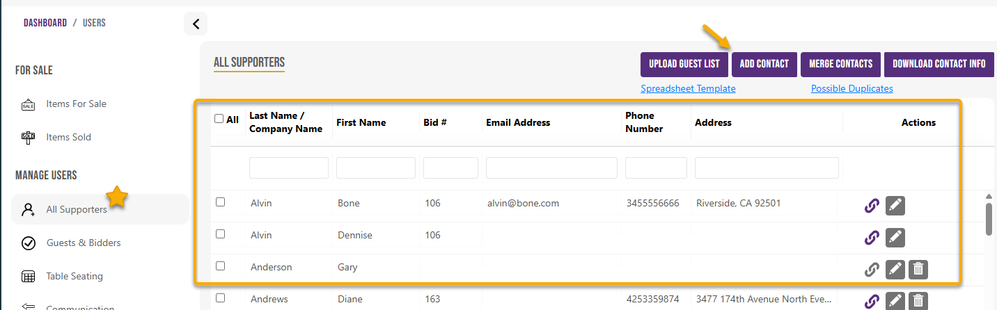- Create a new supporter: Click the Add Contact button and enter the guest info using their real name and information
