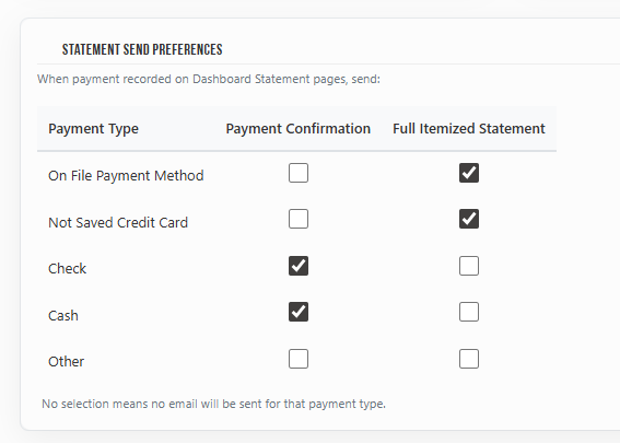 - If no option is selected for a payment type, no email will be sent