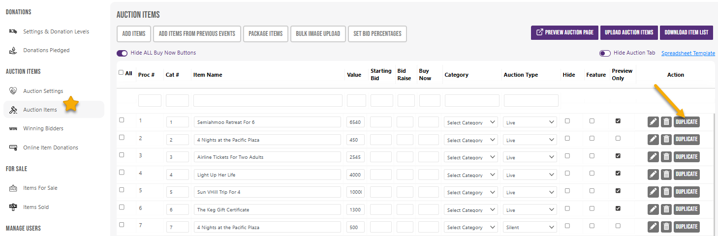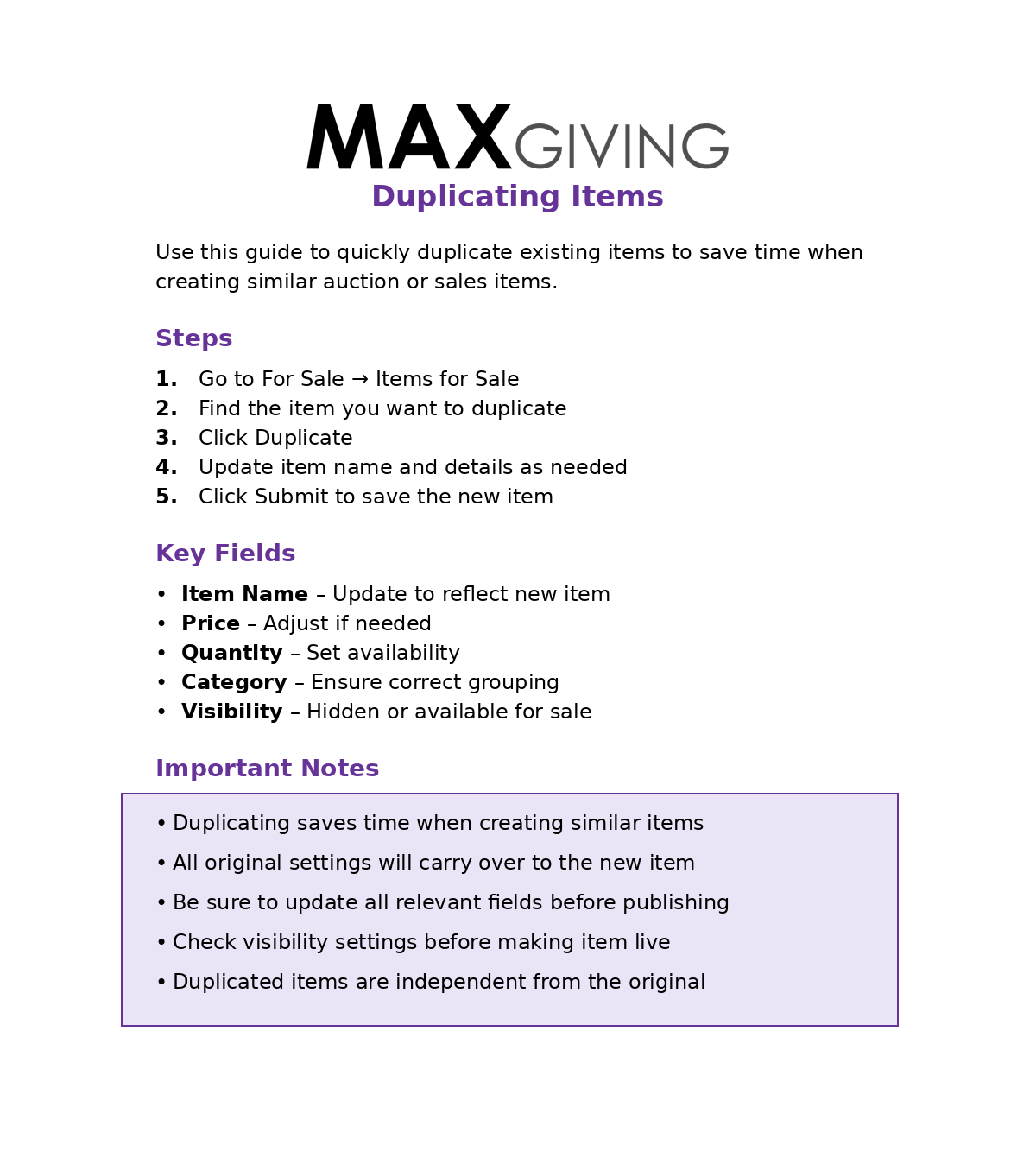 Quickly create multiple copies of an existing auction item—perfect for repeat items, consignment packages, or items sold more than once.